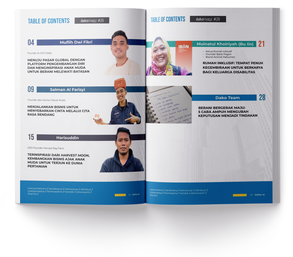 DAKOMAGZ merupakan E-magazine dari Dako Brand and Communication yang memberikan insight menarik dari tokoh-tokoh muda inspiratif yang dapat dibaca di mana saja dan kapan saja.